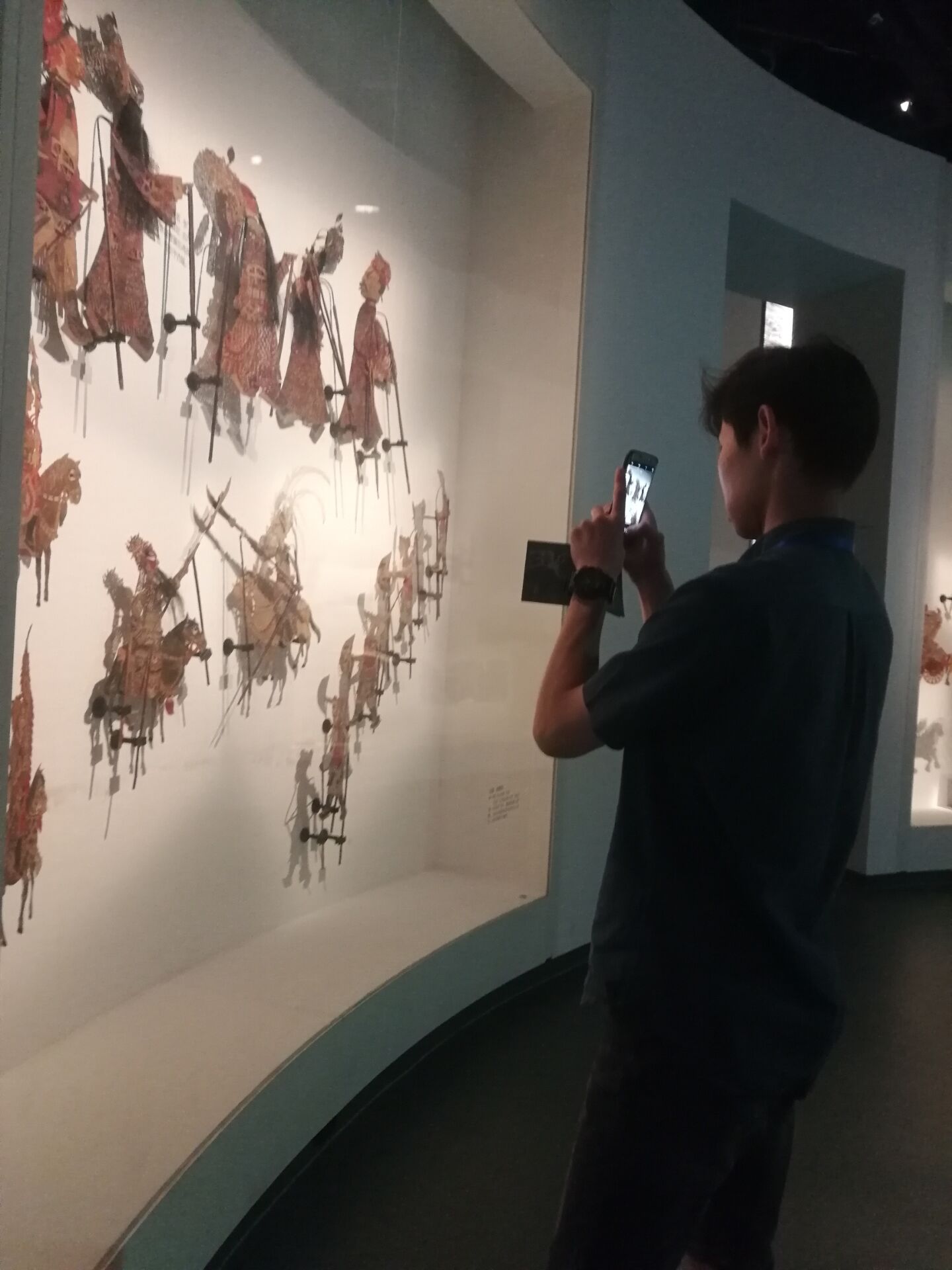 之后,又來到了《花重錦官城——成都歷史文化陳列》主題展,其中陳列了許多有關我國成都歷史的文物,志愿者們時不時與交流生講述文物背后的內涵,幫助交流生更好地理解關于成都文化。最后,參觀了《影舞萬象·偶戲大千——中國皮影木偶展》,中國皮影文化生動有趣,博大精深。交流生們覺得甚是好玩,在展廳參觀了好一會,還觀看了變臉、噴火等有關京劇的視頻。甚至到最后臨近午飯時間,有幾個交流生還戀戀不舍想多參觀一會兒。