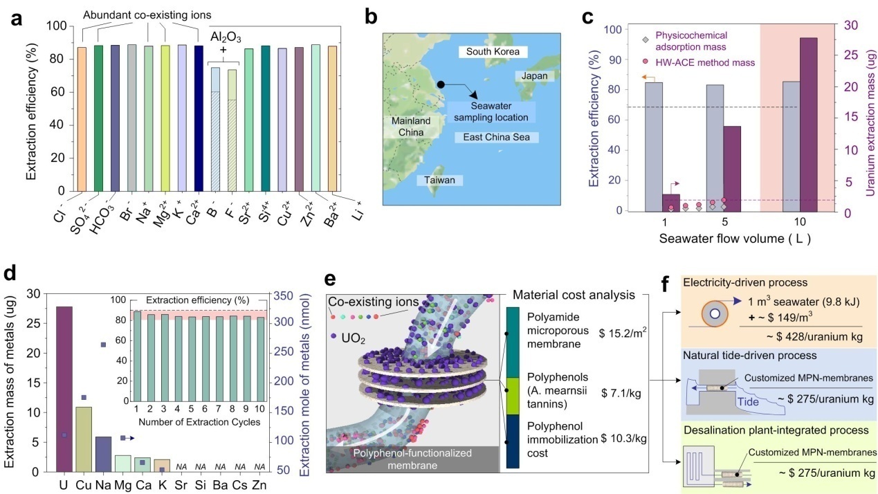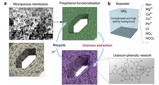 石碧院士課題組通過皮革、化工、材料等多學科的交叉融合,利用鈾能高選擇性的與多酚形成穩定配合物的原理,將植物多酚(單寧)固定在微孔濾膜上,構建出了通量大、選擇性高、可多次循環使用的海水提鈾新型膜材料,解決了目前海水提鈾中的高選擇性及經濟性等關鍵問題。