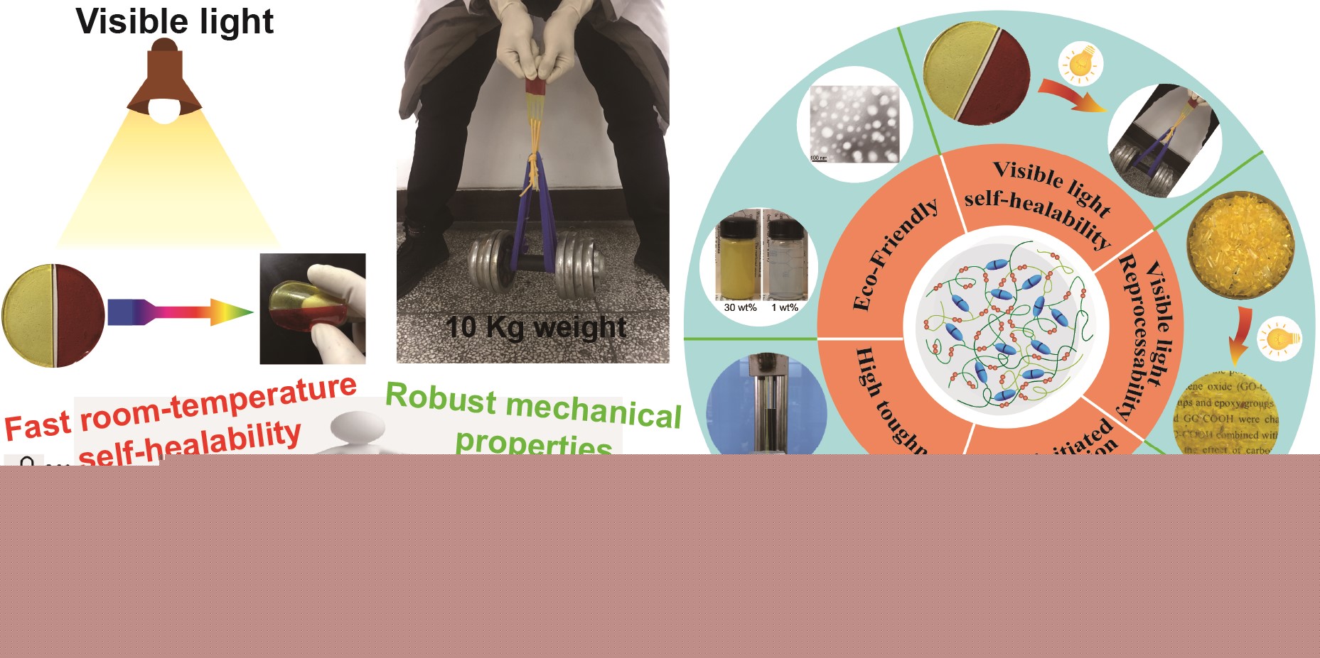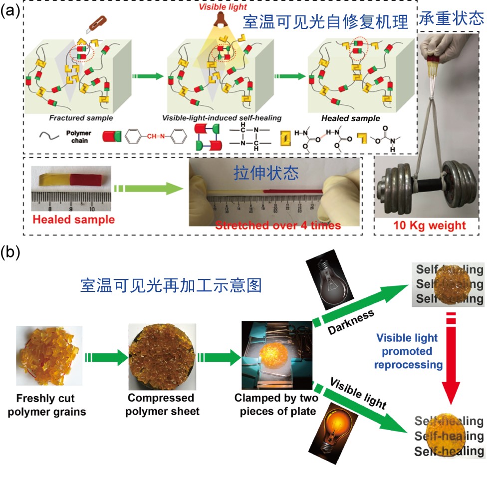 自修復高分子材料的開發能夠提高合成高分子材料的可靠性、耐久性和服用周期,在可穿戴電子皮膚、人工肌肉、柔性電子器件、鋰離子電池、組織工程和涂料等領域具有廣泛的應用。自修復高分子材料室溫化和快速化修復及其力學高性能化和水性化是其當前的重要發展趨勢,但目前已報道的自修復高分子材料在兼具快速室溫自修復性能與高力學性能方面仍需進一步提高,同時其環保性也是亟待解決的問題。光修復具有簡單易得、來源廣泛、可操控性強和可遠程定點投送等優點,可通過光或光熱轉化來誘發動態化學鍵的可逆反應,進而實現高分子材料的自修復。其中,可見光修復由于不存在紫外光修復時高分子的潛在降解問題,也不存在紅外光修復時的顯著光熱效應,有望成為一種更有前景的室溫修復方式。