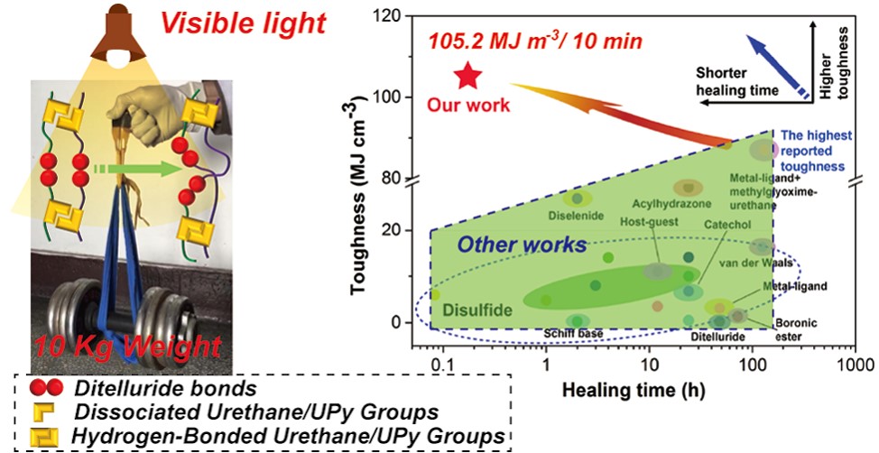 該團隊還利用具有可見光動態響應特性的雙碲鍵(126 KJ /mol),通過在水性聚氨酯的分子主鏈同時引入動態雙碲鍵和2-脲基-4[1H]-嘧啶酮(UPy)四重氫鍵作用,合成出具有的室溫可見光自修復特性的超分子水性聚氨酯(DTe-WSPs)。通過調節DTe-WSPs中的雙碲含量和UPy含量,在DTe-WSPs中同時實現了快速室溫可見光自修復(光照10 min修復效率85.6%)和高力學性能(拉伸強度、斷裂伸長率和韌性分別為19.47 MPa、1144.3%和105.2 MJ m-3),且其韌性達到目前已報道的室溫自修復高分子材料的最高水平。
