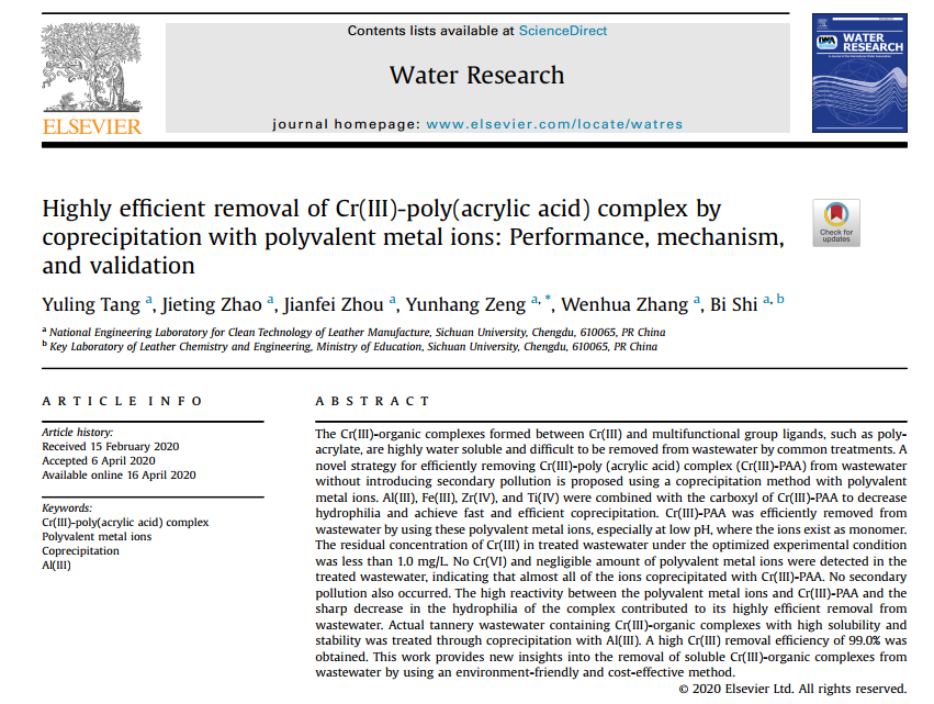 近日,四川大學輕工科學與工程學院生物質與皮革工程系石碧院士課題組在由國際水協會(IWA)主辦,針對全球水污染修復及水環境管理的著名學術期刊Water Research(Nature Index期刊)上發表了題為“Highly Efficient Removal of Cr(III)-poly(acrylic acid) Complex by Coprecipitation with Polyvalent Metal Ions: Performance, Mechanism, and Validation”的研究論文。論文第一作者為專職博士后唐余玲,通訊作者為曾運航副教授。