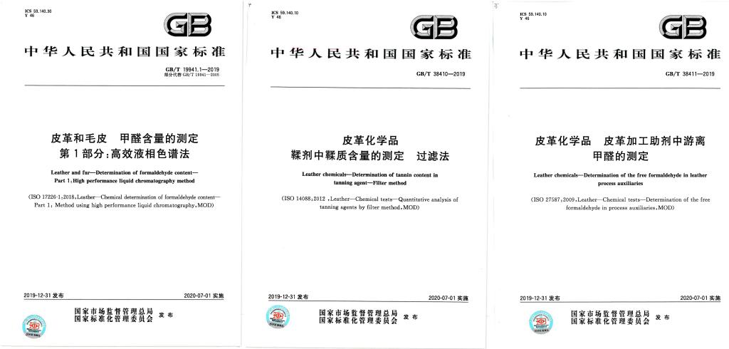 由全國皮革工業標準化技術委員會歸口管理,我院生物質與皮革工程系周建飛教授牽頭起草的GB/T 19941.1-2019《皮革和毛皮 甲醛含量的測定 第1部分:高效液相色譜法》、曾運航副教授牽頭起草的GB/T 38410-2019《皮革化學品 鞣劑中鞣質含量的測定 過濾法》和王亞楠副教授牽頭起草的GB/T 38411-2019《皮革化學品 皮革加工助劑中游離甲醛的測定》等3項皮革、毛皮國家標準,已于2020年7月1日起正式實施。