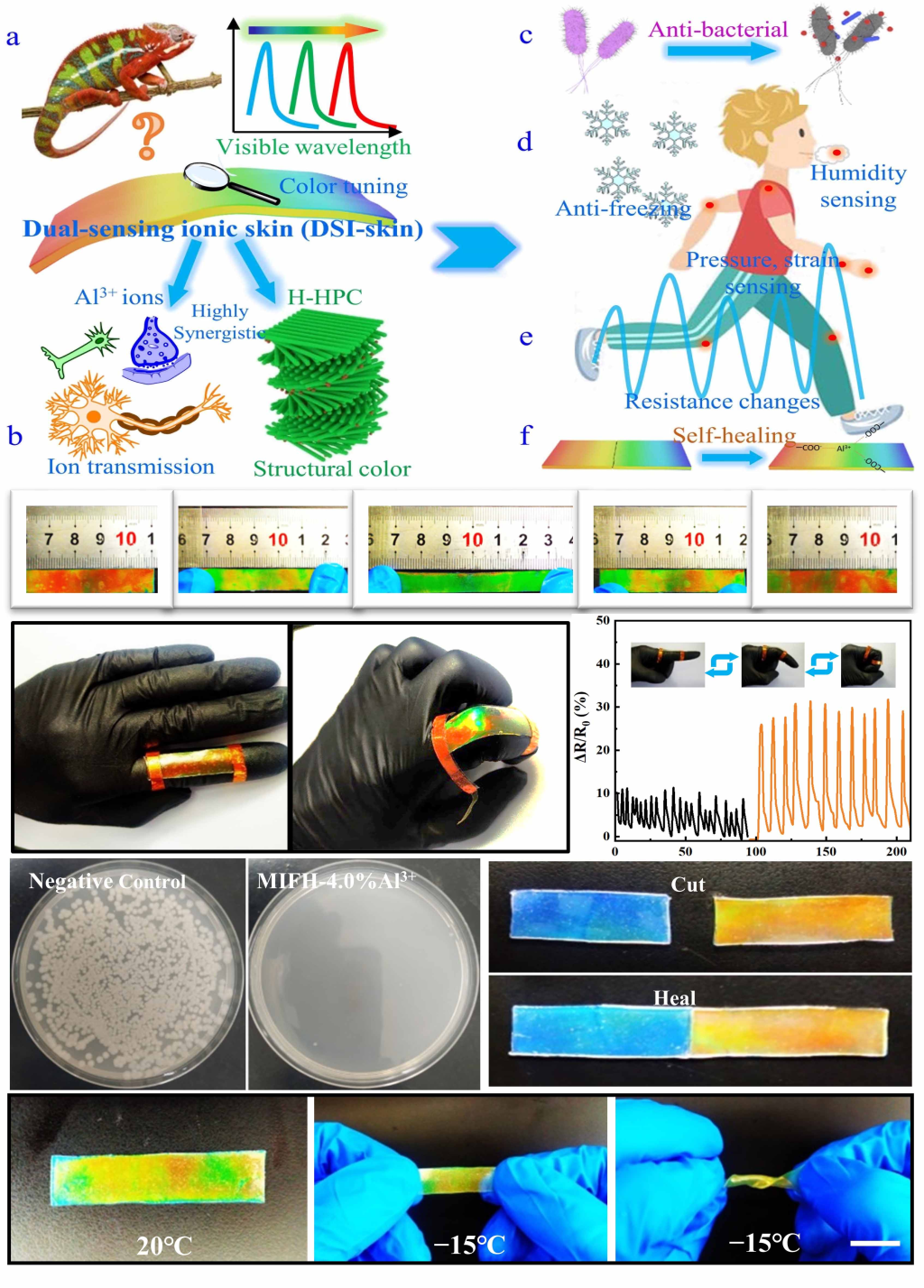 DSI-skin仿生離子皮膚是在含有羧酸根的水凝膠三維網(wǎng)絡中,通過引入Al3+離子來賦予材料離子傳導能力,并利用高取代的羥丙基纖維素(H-HPC)形成膽淄相液晶結構色賦予材料靈敏的變色能力,從而首次實現(xiàn)了同時光電雙模式響應拉伸、壓力和濕度,不僅能夠通過電阻的變化顯示電信號,而且可以通過調節(jié)液晶相的螺距來反映鮮艷的視覺信息,具備數(shù)字化、可視化地監(jiān)控人體運動和呼氣的功能。同時借助Al3+離子和H-HPC的高度協(xié)同效應,實現(xiàn)了快速的顏色調控(426-641nm)、出色的抗菌(Log Reduction>3.43)、自愈(85.0% efficiency)和抗凍(-15℃)等功能特性。這些實用的功能延長了材料使用壽命,擴大了其在許多領域的實際應用。該研究結果將為高性能仿生皮膚、可穿戴設備和生物傳感器制造提供必要的設計指導。