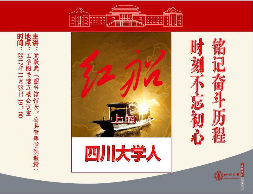 活動伊始,由四川大學圖書館副館長兼副書記、紀委書記杜小軍首先給大家介紹了本次主講嘉賓四川大學圖書館館長黨躍武教授,歡迎了輕紡與食品學院黨委副書記馮國濤老師和到場的各位同學。之后,黨躍武教授結合自身經歷向大家生動展示了他與“紅船精神”的淵源,由此引入本次活動的主題“時刻不忘初心,銘記奮斗歷程——紅船上的四川大學人”。黨教授以黨的第十九次全國代表大會把“不忘初心、牢記使命”寫入大會主題為背景向同學們深刻闡述了紅船精神的內涵“凝結中國共產黨的初心,是開辟中國革命發展道路的強大支柱;體現中國共產黨的使命,是引領人民實現偉大復興的強大力量”,他還向大家介紹了當年在紅船上的四川大學校友,使現場的同學們產生強烈的認同感與自豪感。