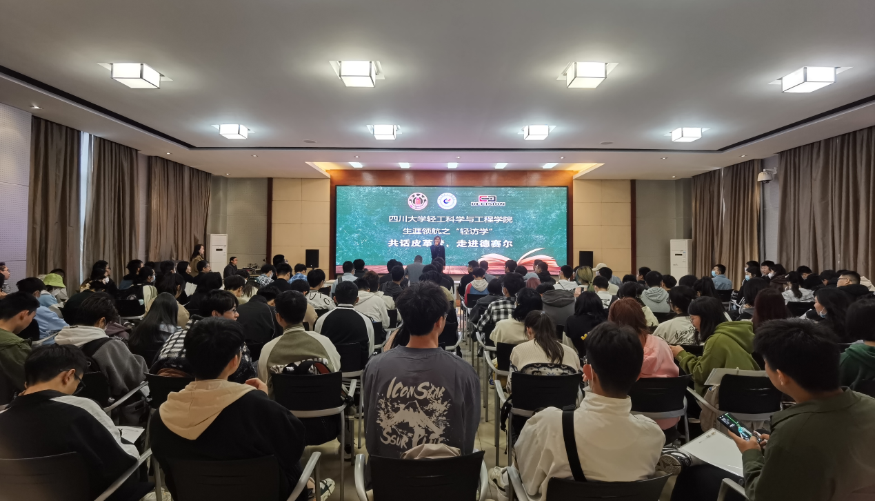 參觀結(jié)束后,公司特別安排了我院在公司工作多年的研發(fā)工程師、技術(shù)骨干等與同學們開展了“共話皮革夢,走進德賽爾”主題交流分享會。首先,公司總經(jīng)理助理吳璐璐為同學們介紹了公司整體情況及德賽爾服務探索之路。接著,公司三位杰出校友——研發(fā)總工曾少余、產(chǎn)品線經(jīng)理龍進、水廠研發(fā)經(jīng)理孫青永博士分享了公司在皮革研發(fā)和皮革應用方面的思考,以及自己對工作的思考,也為同學們的生涯選擇提出了建議。隨后,學院黨委馮國濤副書記進行了講話,馮書記首先對德賽爾公司為此次訪學活動提供的大力支持表示感謝,并談到此次活動的開展加深了同學們對行業(yè)的認識,為大家做好未來職業(yè)發(fā)展規(guī)劃提供了更清晰的認識和新的思考。最后,公司總經(jīng)理丁學東進行了總結(jié)講話。丁總勉勵同學們,“大學是從考場到職場的轉(zhuǎn)變,大學四年不僅應該深入扎實學好專業(yè)知識,更要為自己的未來職業(yè)規(guī)劃做好充分思考和準備,同時職業(yè)規(guī)劃很重要,既要仰望星空,也要扎根基層。”