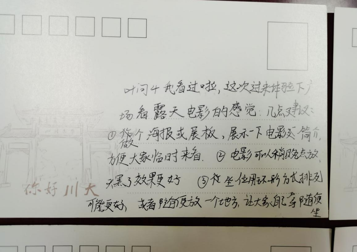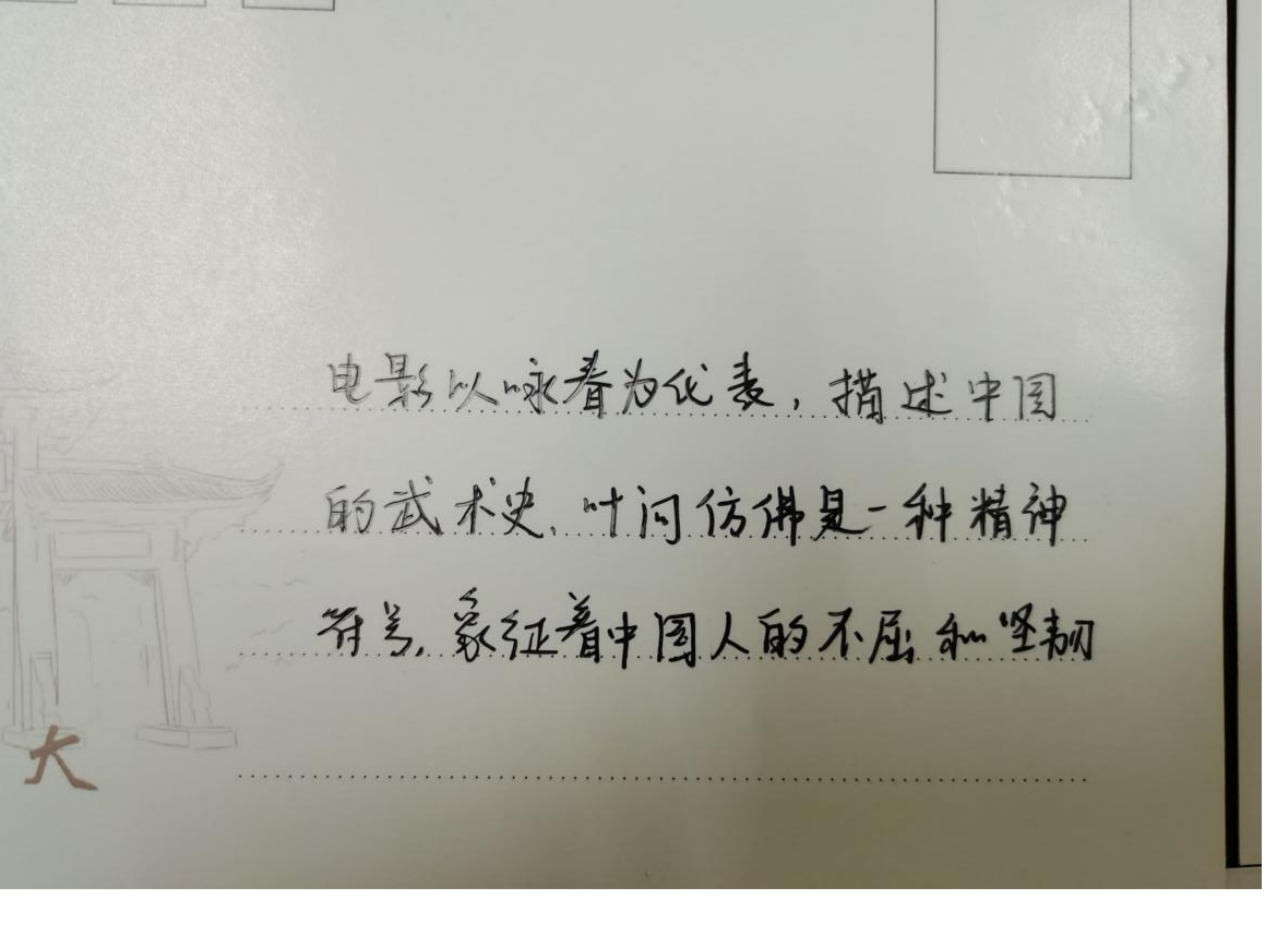 觀影過程中,活動(dòng)負(fù)責(zé)人向同學(xué)們分發(fā)明信片,大家紛紛用文字記錄下自己的觀影體會(huì)。同學(xué)紛紛表示,中華文化,博大精深;中國(guó)功夫,值得傳揚(yáng);中國(guó)人不屈的精神應(yīng)當(dāng)被傳承。同學(xué)們也深深被以葉問為代表的中國(guó)人不屈和堅(jiān)韌精神所感動(dòng)。