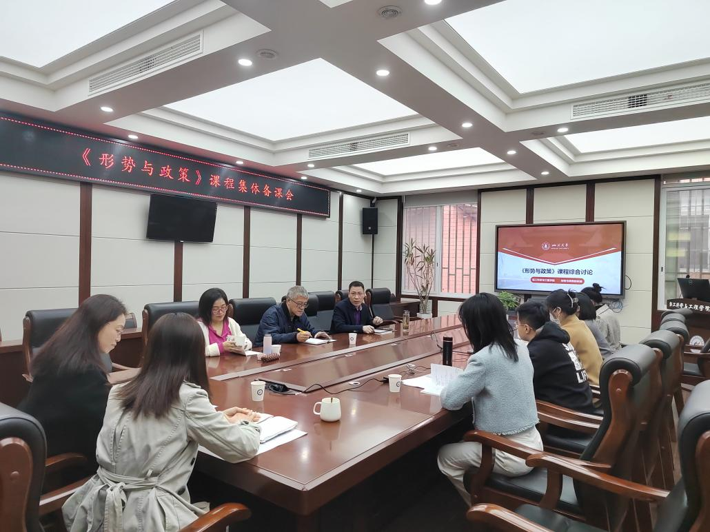 為提高形勢與政策課教學針對性與實效性,增強思想政治教育與學生日常管理的有機結合,2023年11月15日上午10:00,輕工科學與工程學院形勢與政策教研室在望江校區紡工附樓205舉行了2023年秋季學期形勢與政策課的集體備課研討會。學院黨委馮國濤副書記、黨政辦公室主任李慧老師、人才培養與科研管理辦公室主任祝蔚老師、學生事務辦公室主任賀婷老師、各年級輔導員王舒灝老師、余昕玲老師、賈欣駒老師、李有真老師以及校督導組張踐老師、黃茂老師一起參加了集體備課研討會。會議由學院黨委馮國濤副書記主持。