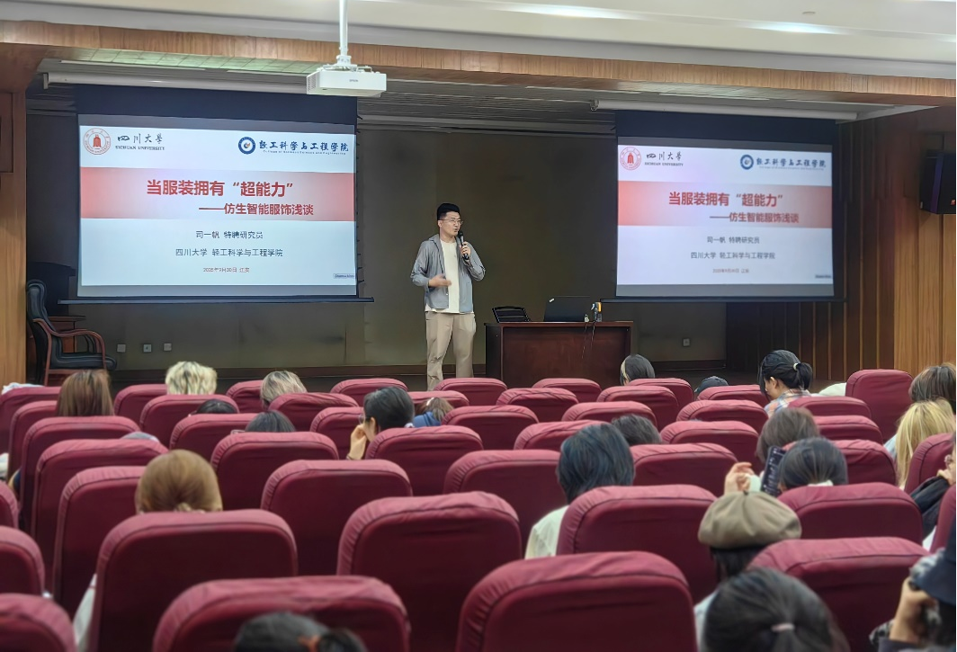 司一帆老師以“荷葉效應”為例,深入淺出地講解了功能材料的研究原理與實際應用。在現場互動中,他將普通紙巾變為防水紙巾的實驗贏得了同學們的陣陣掌聲,激發了大家對功能面料的濃厚興趣。