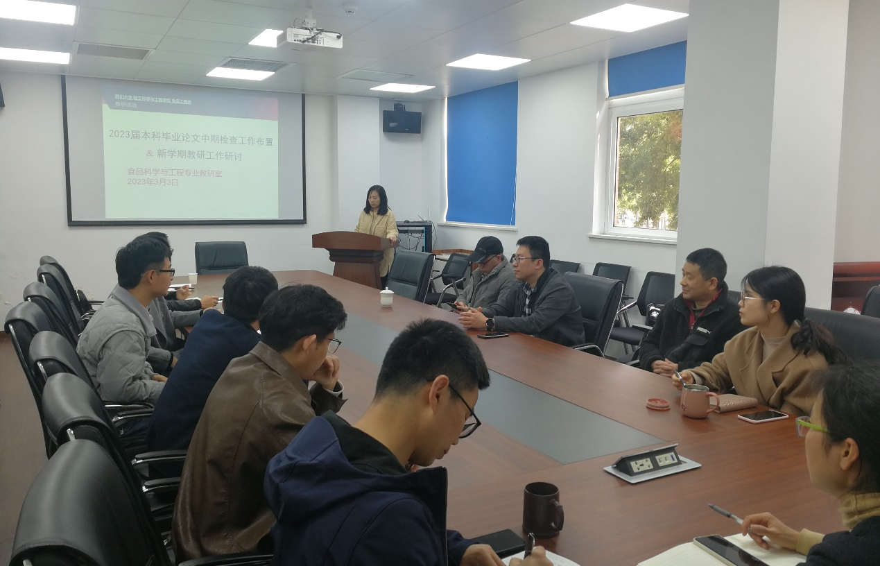 為提高本科畢業(yè)設計(論文)質量,食品科學與工程專業(yè)教研室于2023年3月3日,在紡工樓204開展了畢業(yè)論文中期檢查工作暨新學期教學研究工作研討會,由教研室主任段飛霞副教授主持開展,教研室全體教師參會。