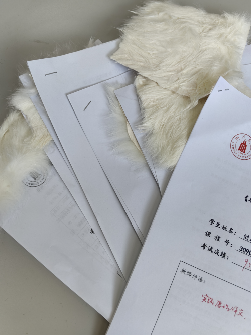 2020級本科生在完成《毛皮工藝學》理論學習之后,走出教室,走進皮革工藝實驗室。首先,任課教師王亞楠教授和周建飛教授講解了實驗方案,強調了兔皮加工的要點;隨后,學生們兩人一組按照實驗方案開始實驗,對家兔原料皮進行了一系列加工操作(包括浸水、脫脂、浸酸、軟化、鞣制、加脂、干整理復鞣等),經過幾天的努力,成功將家免原料皮制成了美觀實用的本色兔毛皮產品。