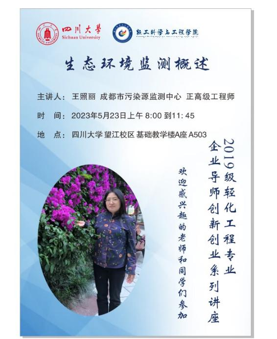 2023年5月23日上午8:00到11:45, 在四川大學(xué)望江校區(qū)基礎(chǔ)教學(xué)樓A座A503室,成都市污染源監(jiān)測中心王照麗高級工程師為學(xué)生們做了“生態(tài)環(huán)境監(jiān)測概述”的專題講座。通過該講座,學(xué)生們掌握了環(huán)境監(jiān)測的目的、水環(huán)境質(zhì)量的類別,明確了環(huán)境監(jiān)測未來的重點發(fā)展方向。通過學(xué)習(xí)《制革及毛皮加工工業(yè)水污染物排放標準》(GB30486-2013)出臺背景以及出臺后對制革工業(yè)發(fā)展的影響,同學(xué)們對行業(yè)有了全新的認識,更加堅定了制革行業(yè)綠色發(fā)展的決心。