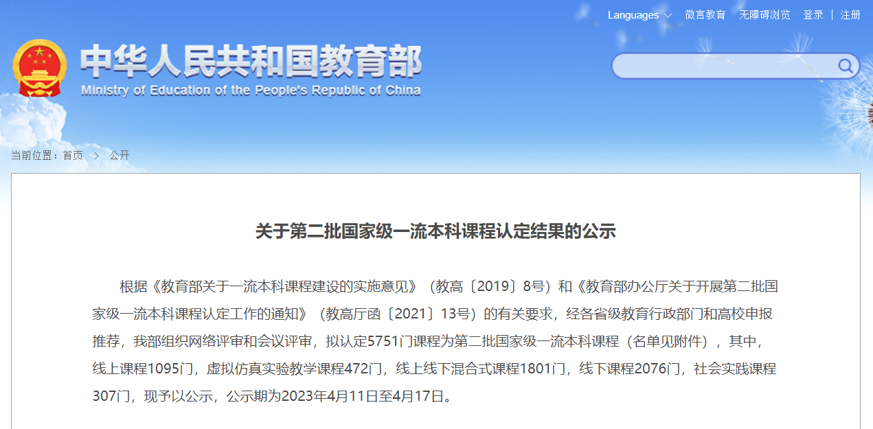 關于第二批國家級一流本科課程認定結果的公示