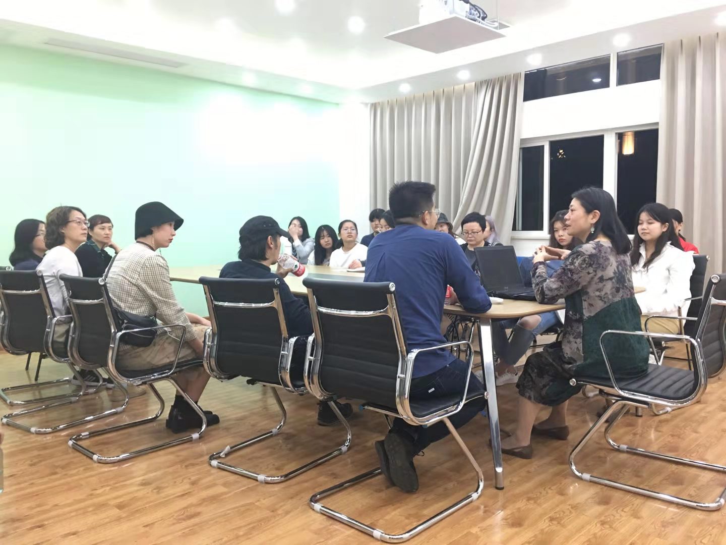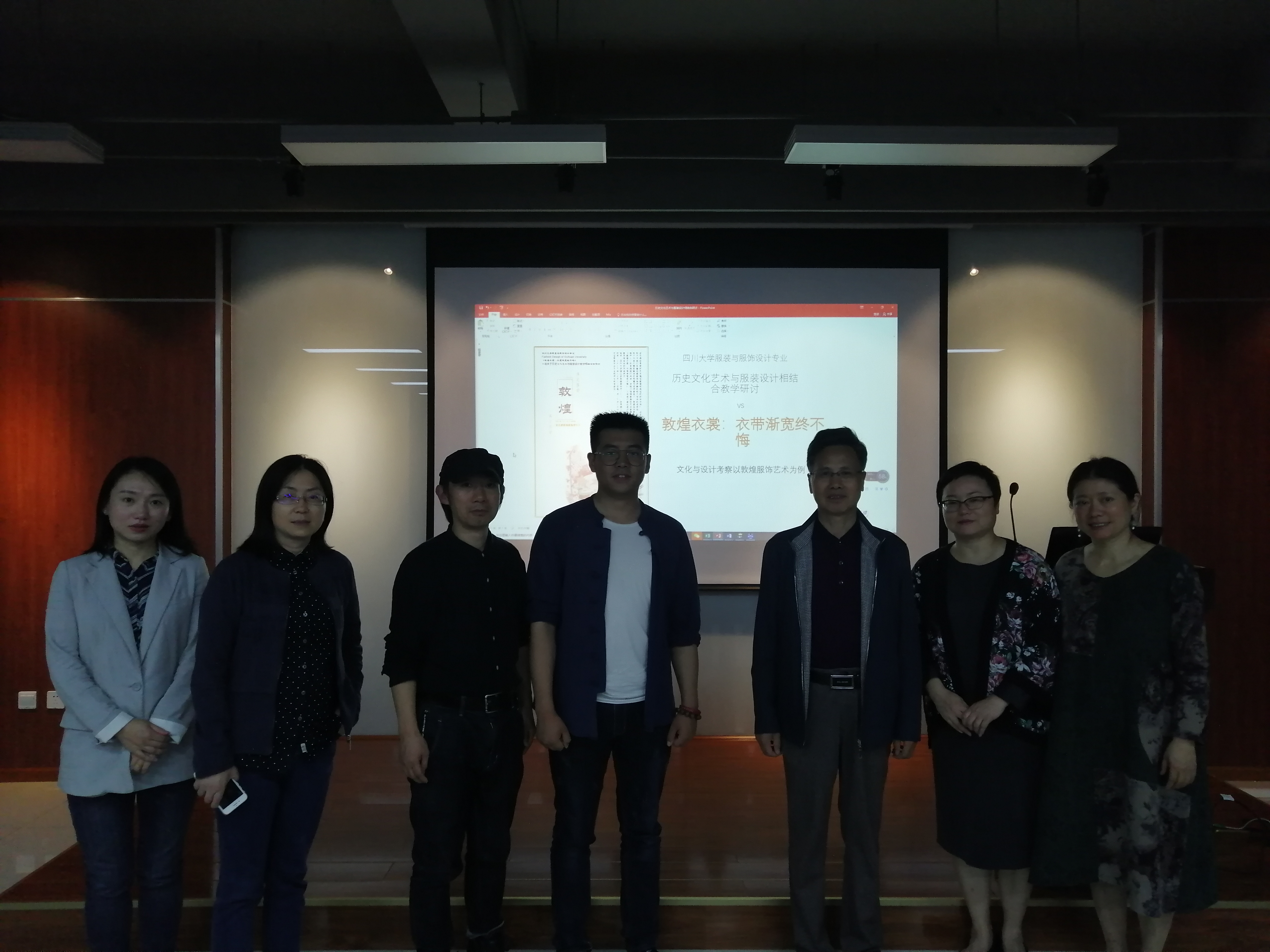 校督導組的傅師申老師也特意來到我們中間,表明了學校對基層教學交流活動的重視。參與教學研討的師生包括教研室負責人趙武、馮潔老師,專業課教師周怡、吳晶、李曉蓉、吳芳、曾琦老師等,參與研討的學生以今年5月到敦煌采風的大四學生為主,他們對敦煌有著美好的記憶,也有來自江安的大一的新生。研討會特別邀請了被敦煌魅力感染,敦煌歸來激發了創作熱情以敦煌印象為主題設計制作了系列服裝的武子涵同學,與我們交流她的創作。現場關于敦煌藝術及相關問題、在服裝教學中如何引導學生創作,老師與同學之間,以及與來自敦煌研究院的邢耀龍交流熱烈氣氛良好有不錯的效果。