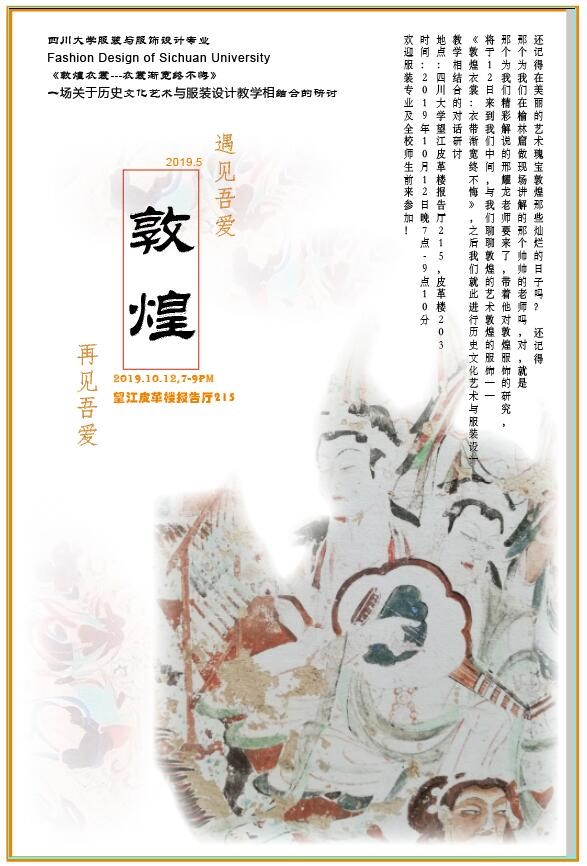 在今年春夏之季5月初,帶著教學任務的服裝專業師生來到敦煌地區進行歷史文化與藝術的考察,走訪了榆林窟、莫高窟、西千佛洞、酒泉市黃泥堡裕固族鄉等地的歷史遺跡與民族服飾文化,在榆林石窟有緣結識了來自敦煌研究院邢耀龍,他對敦煌歷史文化藝術的學識認知與生動的講解感染了大家,在石窟中的講解時間有限,為提高服裝專業學生對敦煌歷史與服飾文化藝術更深入的了解,深入將歷史文化與服裝設計教學有機生動的結合, 在金秋10月國慶后我們邀請了邢耀龍走進校園,為我們帶來敦煌服飾相關的專題講座《敦煌衣裳:衣帶漸寬終不悔》,同時與我們服裝專業師生一起進行了一場關于歷史文化藝術與服裝設計相結合的教學研討。