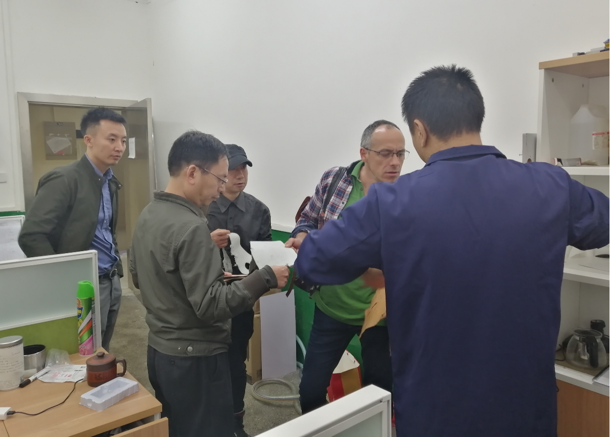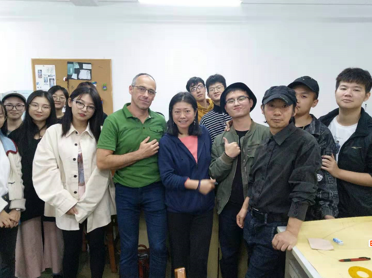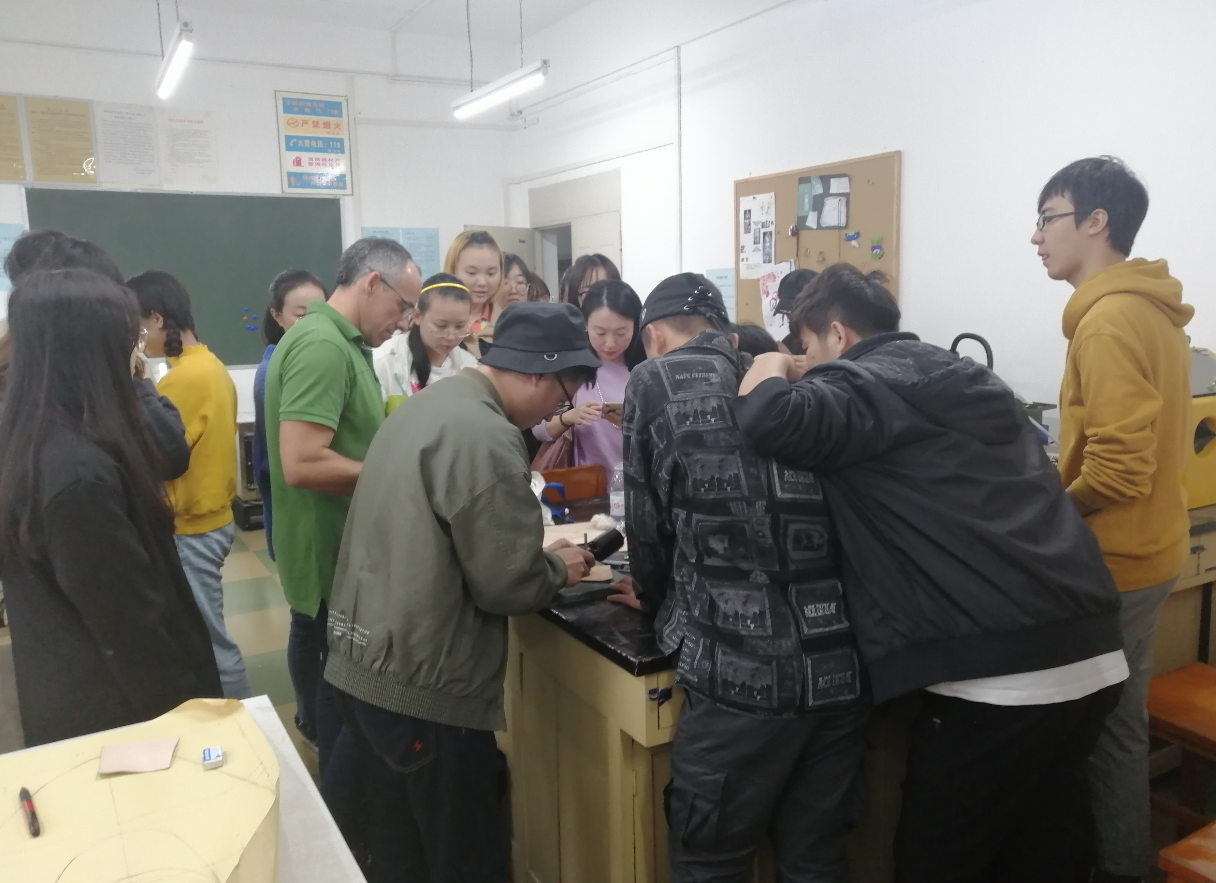 在服裝教研室的邀請下,朱得安于10月21日下午3點半來到我校與趙武、馮潔、徐波、曾琦等師生交流。首先在皮革樓209進行座談,然后在生物質(zhì)與皮革工程系張金偉老師陪同下參觀了皮革樓實驗室,對皮革材料的工藝進行了交流。4點半來到了紡工樓5樓服裝專業(yè)的服飾配件實驗室與服裝專業(yè)的同學們進行了深入的交流,對同學們的皮包設計圖的結(jié)構、材料的選用及設計與制作構想進行了探討,將隨身背包的設計與制作理念介紹給大家,包括對于負重的背包選用皮材的特點,裝釘?shù)奈恢玫取4蠹覍Ρ嘲系牧咙c---刻花非常欣賞,就此刻花的方法展開了探討,朱利安從背包里拿出專門帶來的皮革制作工具、環(huán)保的皮革樣片演示起制作方法。 從他的熟練、專注與確定的刻花落點、花型的轉(zhuǎn)換,師生們感受到了皮革刻花的上佳制作技藝是怎樣的場景。親自示范之后,邀請大家都來嘗試體驗皮上刻花,同學們上手很快就成了專注的皮革手藝人。朱利安現(xiàn)場制作的圖案造型組合出有序的線條美,讓我們切身見證了非遺傳承---皮革制品的手工雕刻之美。