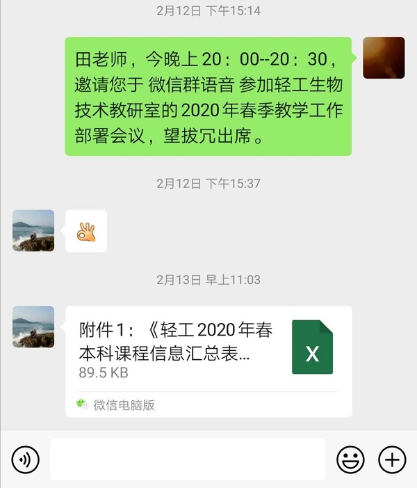 為更好地開展新學期教學工作,2020年2月12日20:00輕工生物技術教研室利用微信語音召開了新學期教學工作安排交流會,教研室所有任課教師出席會議,會議由教研室主任周榮清老師主持。