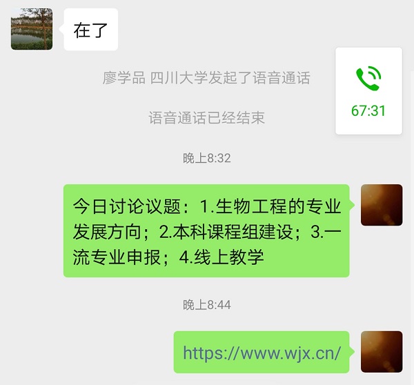 為更好地開展專業選修課教學工作,2020年3月17日20:00教研室利用微信語音在線召開了生物工程本科教學工作交流會。會議由教研室主任周榮清老師主持,教研室廖學品、李國英、田永強、吳重德、辜海彬、湯華釗、金垚等任課老師出席了會議。