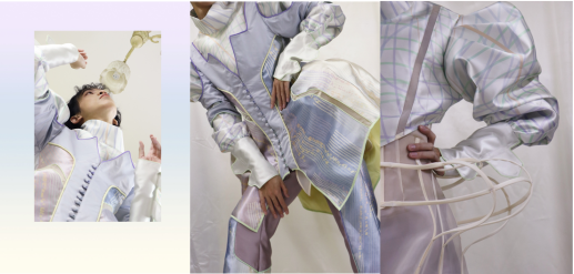 圖2作品主題為《Projective Ego(投射自我)》,創(chuàng)作是從前期靈感調(diào)研延伸而來的曲面空間關(guān)系,以鏤空拼接、滾繩等工藝來創(chuàng)造服裝的立體感和透氣感,大量運(yùn)用了平面制版和立體裁剪相結(jié)合的方式來塑造服裝的廓形。每套服裝的制作,都通過初期坯樣、通過平裁/立裁來實(shí)驗(yàn),選擇最佳的方式盡可能還原效果圖;同時(shí)選用了不同的面料來實(shí)驗(yàn),選擇最佳的效果;中后期模特試穿、調(diào)整修改、二輪樣衣的過程逐漸修改確定到最終版型。