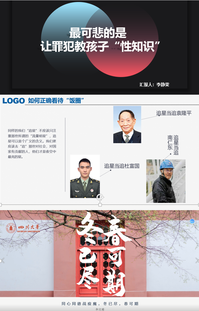 評選過程各年級輔導員老師先從選課學生中推薦2-3個作品,教研室全體老師在所有推薦作品中進行評選?!颁J評5分鐘”優秀文章從緊扣熱點、立意新穎深刻、條理清晰、文筆流暢幾個方面進行選評,最終評選出2017級本科生李靜雯的文章《最可悲的是讓罪犯教孩子“性知識”》、2017級本科生付靖朝的文章《淺談企業的社會責任三層次》、2018級張淑瑜的文章《淺析西方國家疫情為何如此嚴重》、2019級本科生項振宇的文章《跑偏的“飯圈文化”》以及2019級本科生呂家琪的文章《鮑毓明事件引發的思考》共5篇文章。主題實踐活動根據選題緊扣時事熱點、理論聯系實際、表達清晰、展示效果佳幾個方面進行評選,最終評選出2016級本科生趙毅冉《UFC――張偉麗PK喬安娜》、2017級本科生邱浩楠小組的作品《互聯網時代愛國主義的新特征和當代大學生的擔當》、2018級本科生和文婧小組作品《同心同德戰疫魔,冬已盡,春可期》以及2018級本科生李若水的作品《淺析新冠疫情對國內化工行業的經濟影響》共4篇作品。