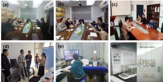 座談及實地考察圖片 (a-c)座談,(d)溝通捷克TESCAN掃描電鏡,(e)參觀激光共聚焦熒光顯微鏡,(f)氣路
