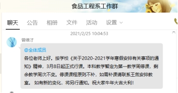正式行課前,本科教務員通過短信、QQ群等方式多次提醒任課老師做好上課準備。并通知各系教學系主任、教研室主任開展自查,督促任課老師做好新學期教學準備工作。學生輔導員及時統計學生到校情況,督促學生做好上課準備,學院本科教務員將不能按時返校的學生信息發送給相關課程老師,提醒老師做好相關學生的線上教學安排。