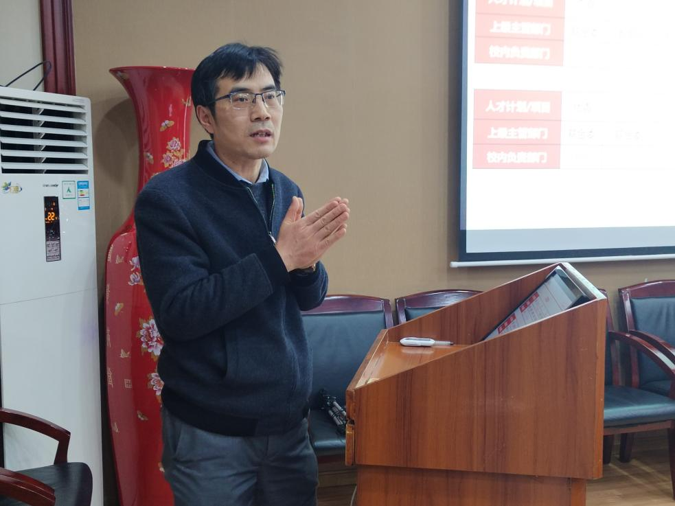 緊接著,學(xué)校人事處人才工作辦公室主任楊偉教授向與會(huì)人員作了《國(guó)家級(jí)人才計(jì)劃相關(guān)工作交流會(huì)》的報(bào)告,詳細(xì)介紹了國(guó)家高層次人才申報(bào)項(xiàng)目?jī)?nèi)容、資助政策以及評(píng)審相關(guān)標(biāo)準(zhǔn),并在學(xué)院相關(guān)專(zhuān)業(yè)引才育才方面給予了政策建議和方向指導(dǎo)。
