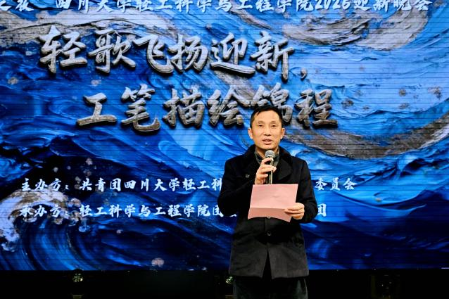 晚會伊始,學院黨委書記李天富致辭,代表學院向2025級新生表示熱烈歡迎,他勉勵同學們主動對接國家戰略需求,聚焦綠色制造、生物基材料、智能輕工等前沿方向,錘煉本領、勇于探索,在川大這片沃土中成長為有理想、有擔當的時代新人。
