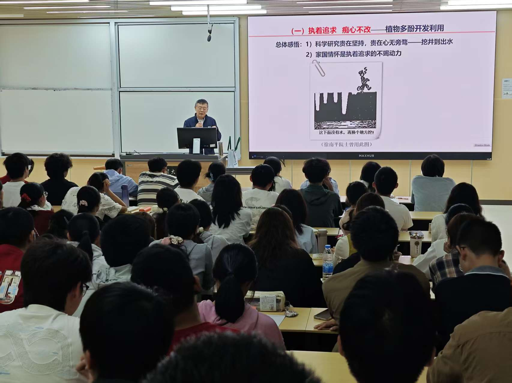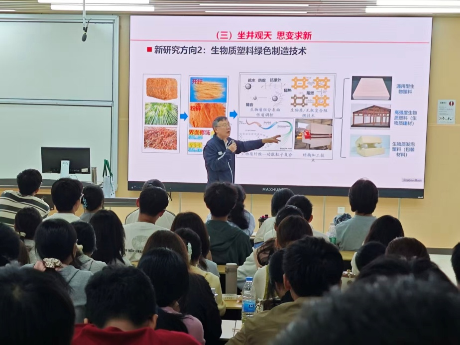 課堂上,石碧院士沒有講授深奧的理論,而是從自身經歷出發,娓娓道來。他首先分享了博士初期三年始終“執著追求,癡心不改”的階段,強調基礎積累與心態調整的重要性,讓同學們認識到科研道路上堅持的寶貴。隨后,他講述了如何用六年時間將博士階段的成果推廣應用,又用長達十一年的潛心研究攻克遺留難題,這一“鎖定目標前行,沿途產出成果”的經歷,向新生們清晰地展示了系統性科研的路徑。
