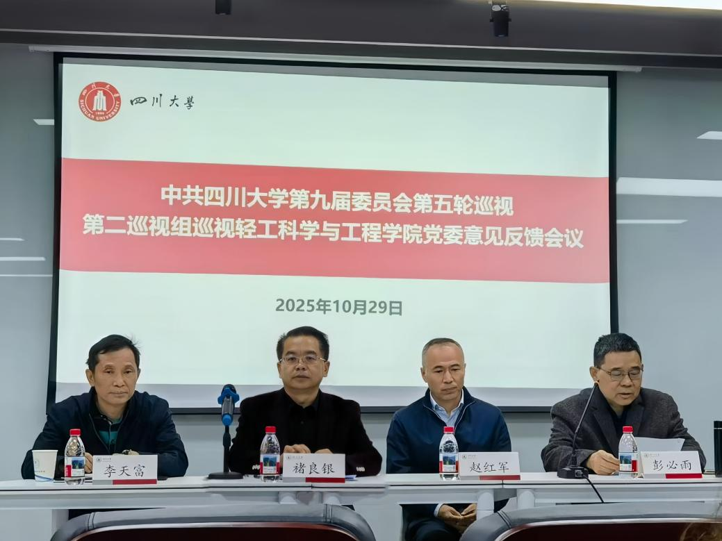 根據(jù)學(xué)校黨委巡視工作統(tǒng)一安排,2025年10月29日,學(xué)校第九屆黨委第五輪巡視第二巡視組向輕工科學(xué)與工程學(xué)院黨委反饋巡視情況。褚良銀常務(wù)副校長(zhǎng)出席巡視反饋會(huì)議并提出整改工作要求。第二巡視組組長(zhǎng)趙紅軍分別向輕工科學(xué)與工程學(xué)院黨政主要負(fù)責(zé)人和領(lǐng)導(dǎo)班子反饋了巡視情況。輕工科學(xué)與工程學(xué)院黨委書(shū)記李天富就做好巡視整改工作表態(tài)發(fā)言,院長(zhǎng)彭必雨主持會(huì)議。
