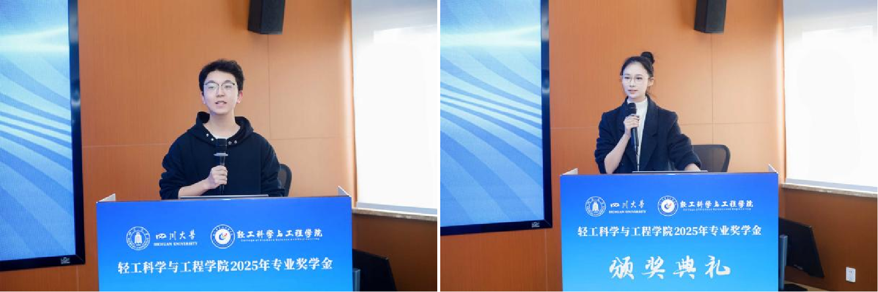 頒獎結束后,本科生代表許藝瀧、研究生代表劉恒宇發言,他們表達了對設獎單位及學院的感謝,表示將以獲獎為新起點,深耕專業、錘煉本領,投身行業創新實踐,成長為行業棟梁。